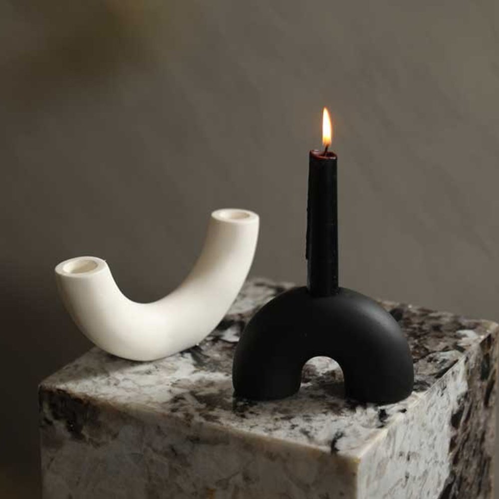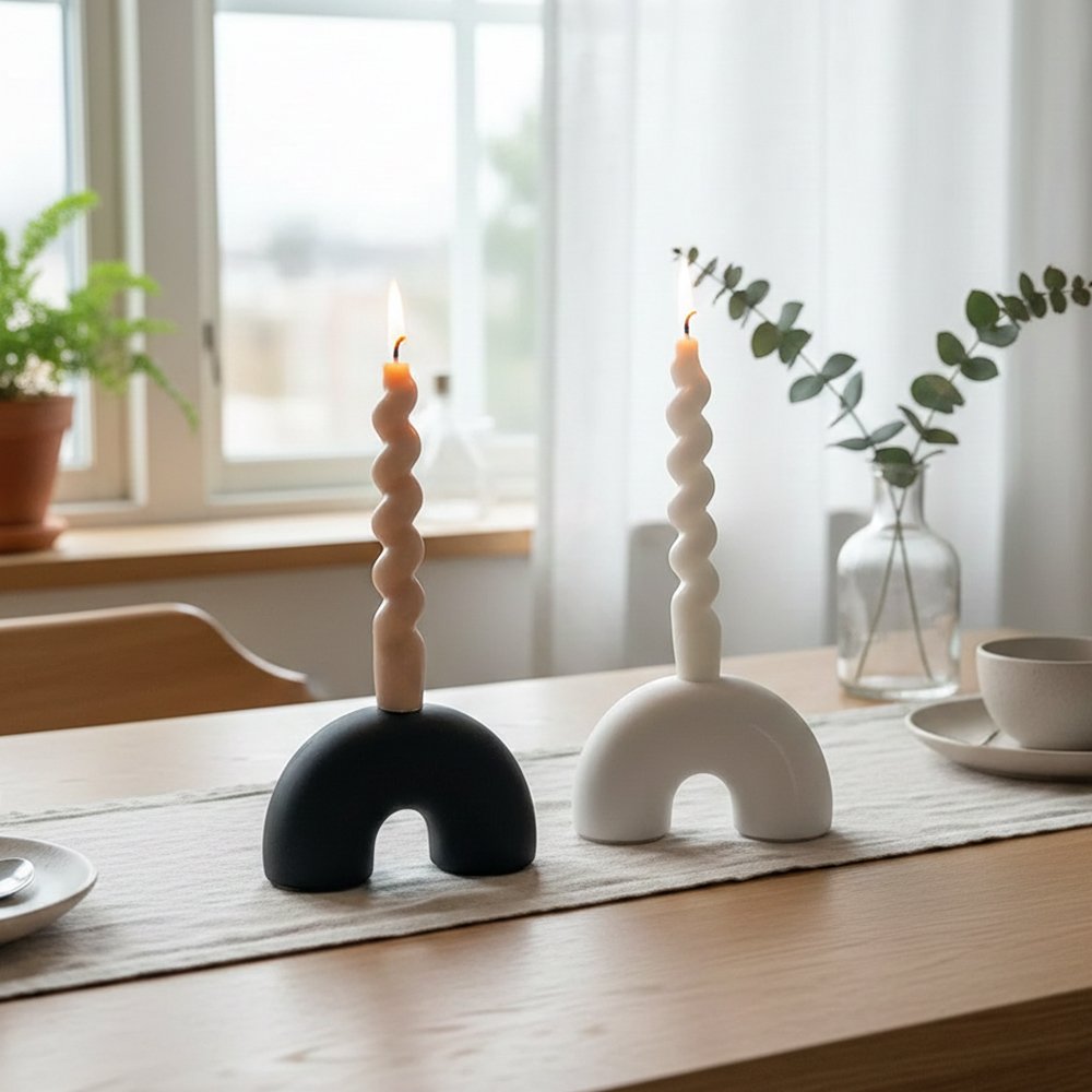 This modern ceramic candle holder features a sculptural arch-shaped base with smooth curves and a refined matte finish. Designed in timeless black and white, it brings a calm, minimalist presence to any space.