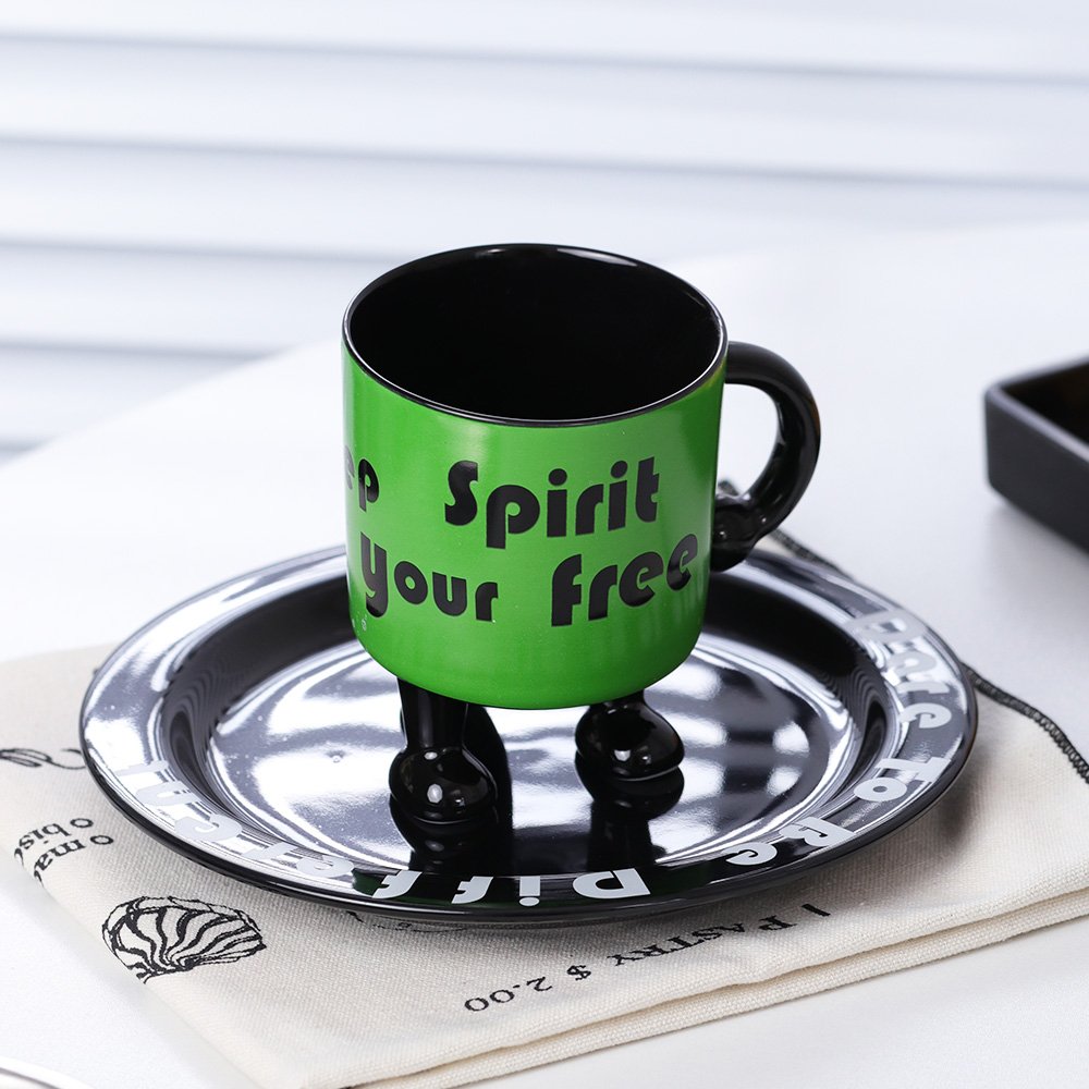Unique Monster Series Coffee Mug Set with Saucer – Creative Letters 3-Legged Ceramic Espresso Cups (5.1 oz / 150ml) 5 Colors Black, Navy, Purple, Sky Blue & Green – “Keep Spirit·Your Free” Tripod Porcelain Mug Set for Gifts