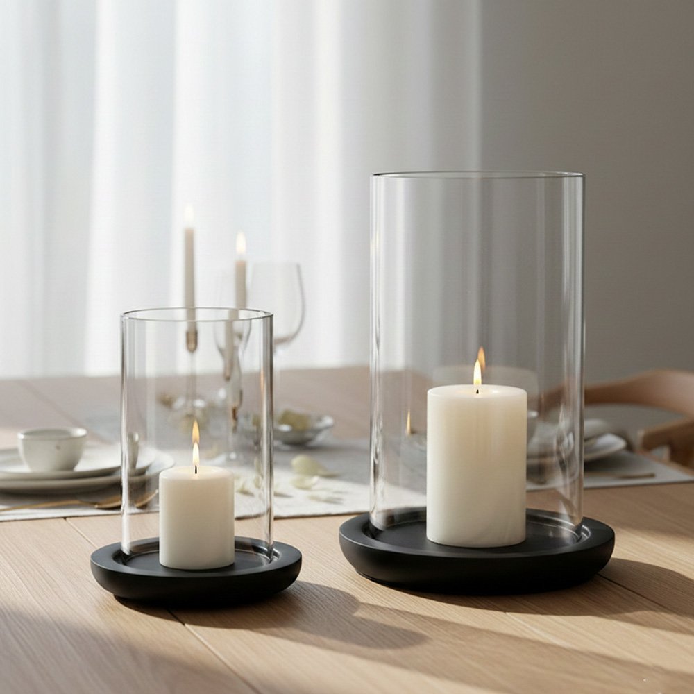 Each holder consists of a crystal-clear borosilicate glass cylinder that rests securely within a specially grooved, 12.5cm diameter black wooden pedestal. This design not only protects your surfaces from wax and heat but also creates a “chimney” effect that prevents flickering or extinguishing from drafts, making it perfect for both indoor tables and outdoor event settings.