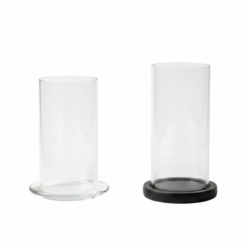 Elevate your ambient lighting with this Fillable Borosilicate Cylindrical Glass Candle Holder. Combining the industrial clarity of high-quality glass with the organic feel of a black wooden base, this piece serves as both a functional windproof shield and a high-end decorative accent for any interior space.