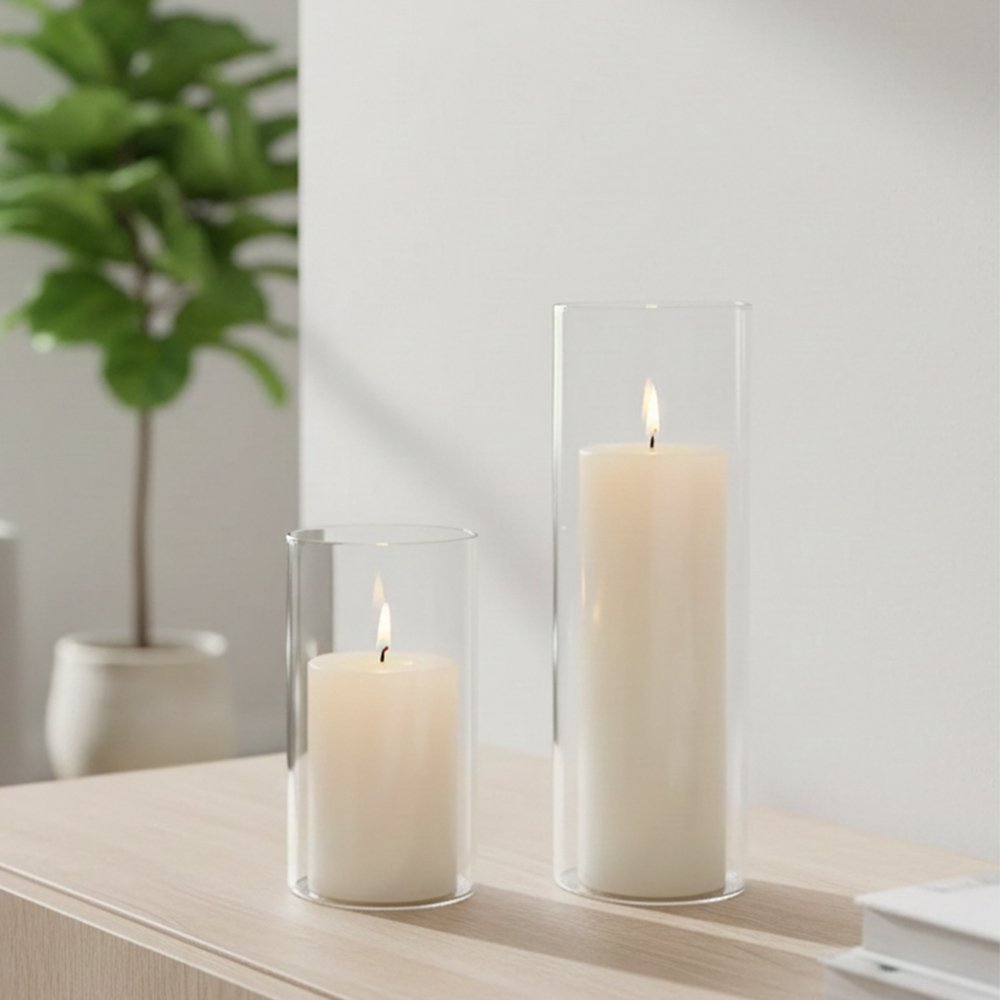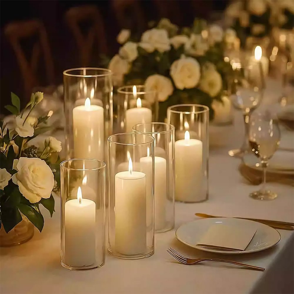 Enhance your decor with these elegant, clear borosilicate glass cylinder holders. Perfect as hurricane chimneys for open flames or as fillable floating candle holders, these versatile vases bring a sophisticated touch to weddings, home interiors, and special events.