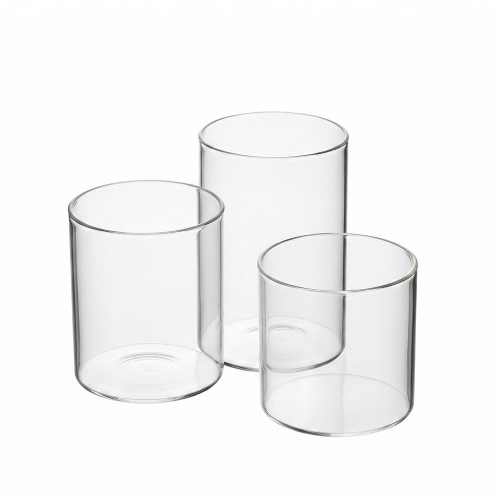 Create stunning visual displays with this set of Fillable Borosilicate Cylinder Glass Holders. Crafted from premium, transparent glass, these cylinders offer a sleek and modern aesthetic that complements any theme, from rustic weddings to contemporary home styling.
