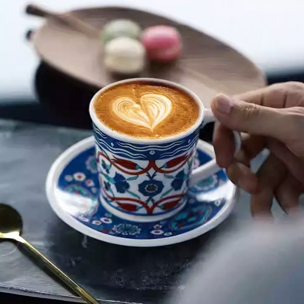 Immerse yourself in the enchanting charm of traditional craftsmanship with our Turkish-Inspired Porcelain Cup & Saucer Set. This collection serves as a bridge between ancient aesthetics and modern utility, making it an essential addition for any coffee lover’s home.